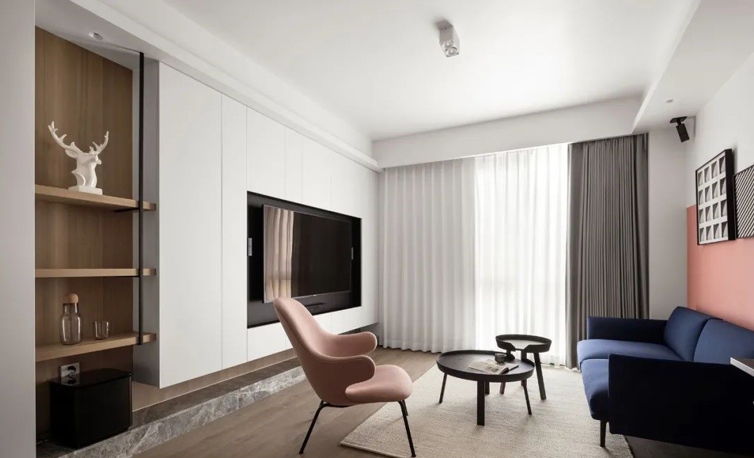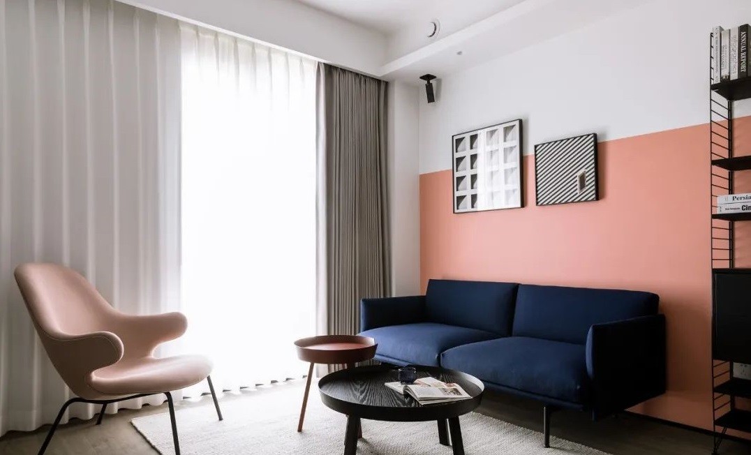 色彩搭配:背景为黑白灰与原木,用藏蓝色沙发、粉色抱枕或装饰画进行点缀,活泼不张扬。