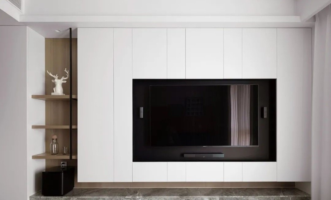 多功能电视墙:一体式收纳柜从餐厅延伸至客厅。部分开放设计(原木背板),部分封闭(白色柜门),底部是云灰色大理石地台,实用与颜值并存。