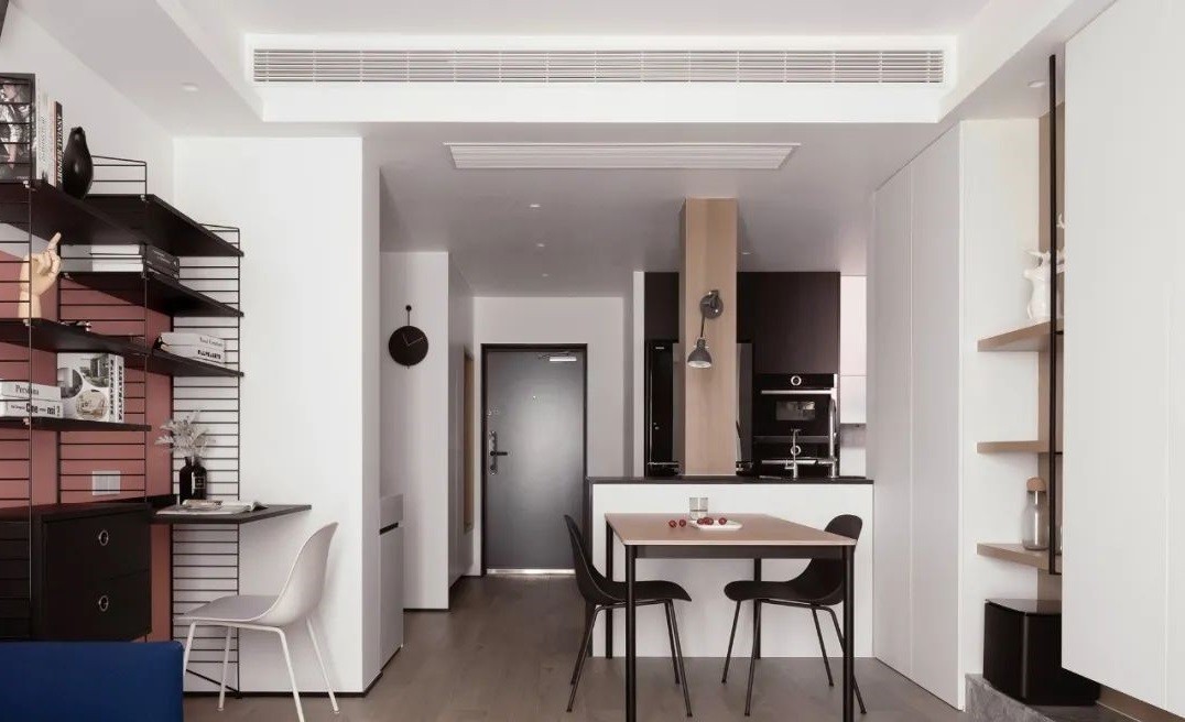 本案围绕 “简练美学、超级收纳、灵动互动” 三大核心展开。在有限的空间内,通过开放式布局、精细化收纳系统和巧妙的动线改造,不仅满足了双卧+书房的基础需求,更创造了一个高效互动、充满情感温度的居住环境。色彩上以黑白灰为基调,原木色温润空间,粉色与藏蓝色的跳跃,精准地营造了简约中的活泼感。