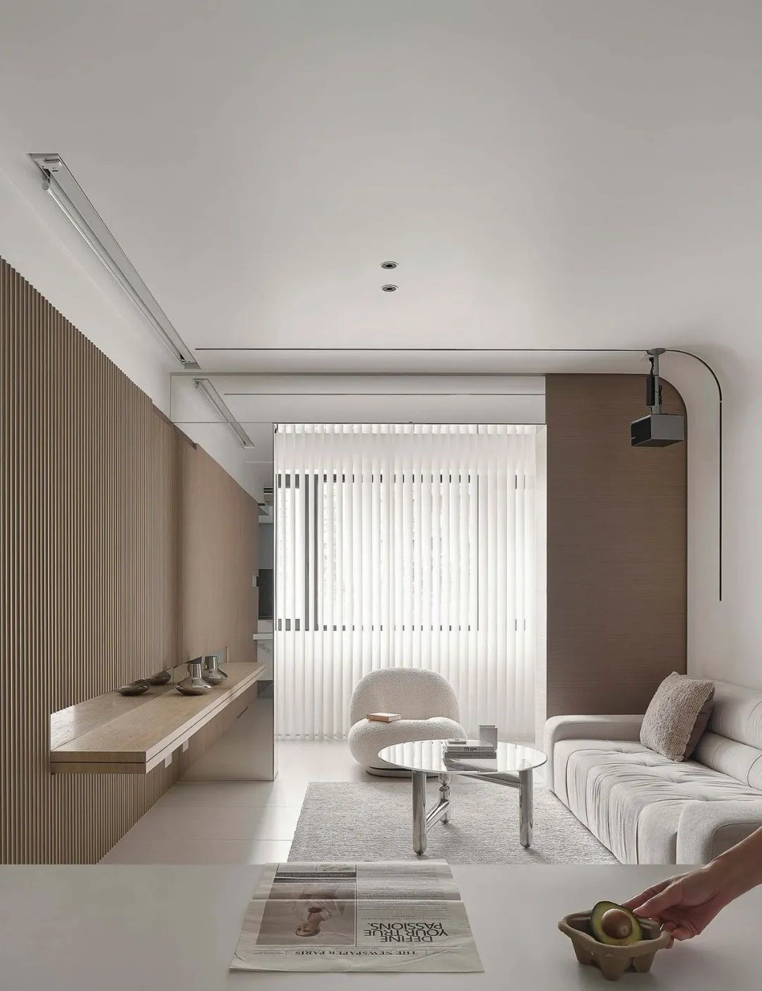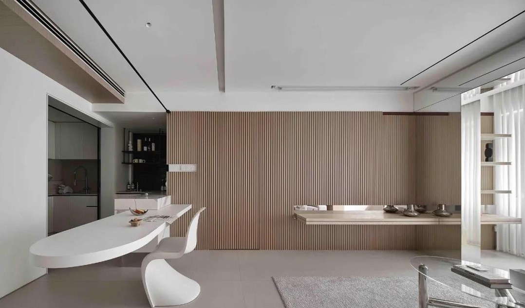隐形门:整面木格栅背景墙巧妙隐藏主卧门,保持立面统一。