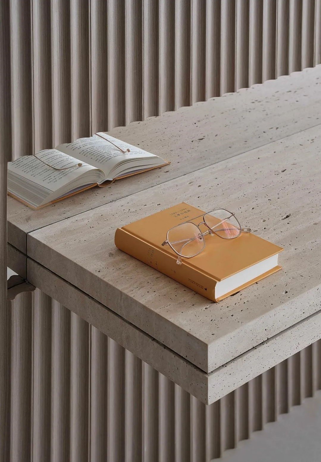 创新形式:用洞石层板替代传统电视柜,造型利落,凸显质感。
