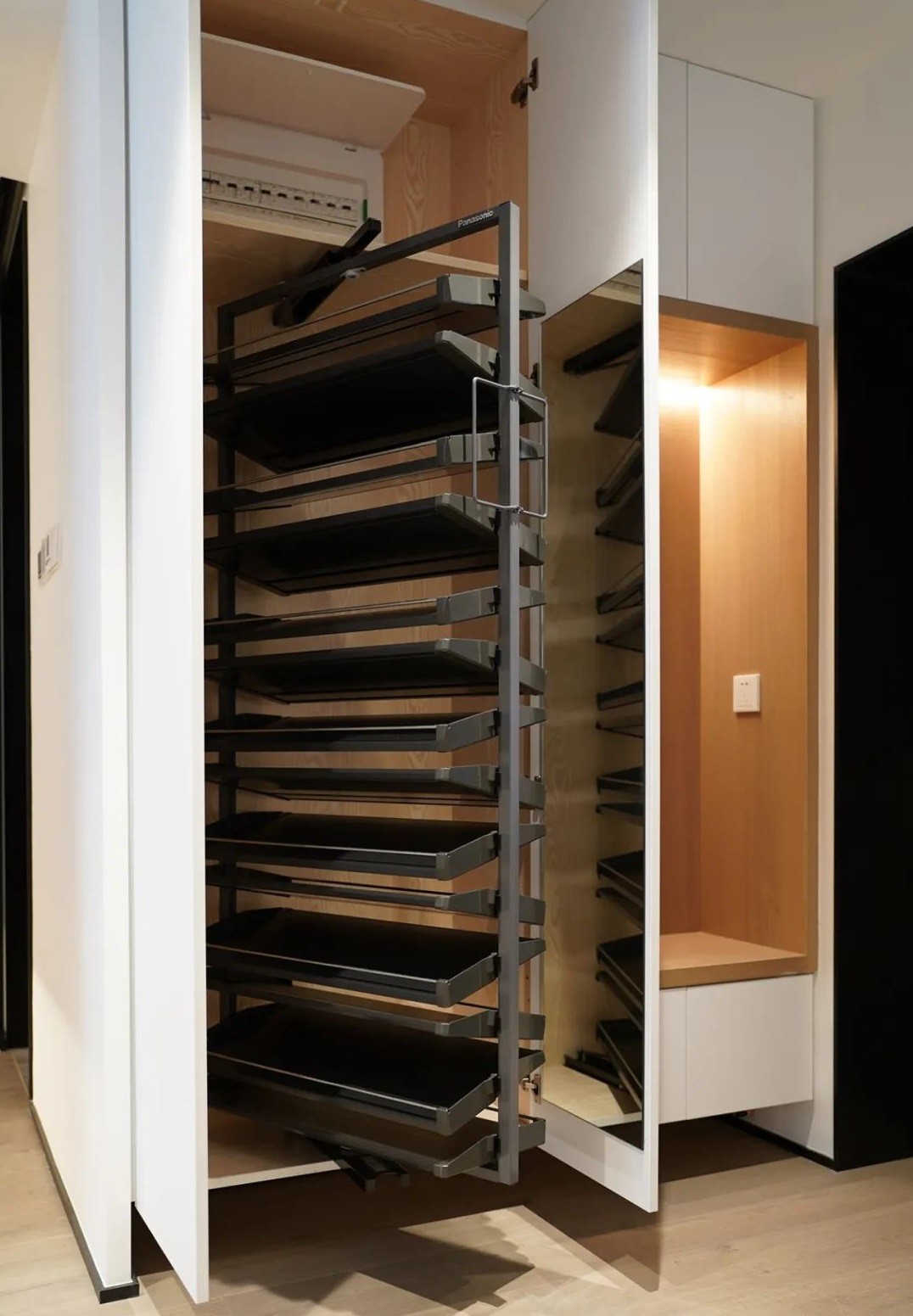 智能收纳:内部安装旋转鞋架,容量翻倍。柜门内侧集成穿衣镜,巧妙隐蔽,化解风水顾虑。