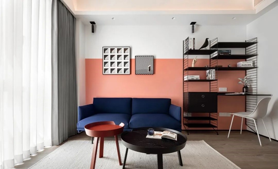 色彩搭配:背景为黑白灰与原木,用藏蓝色沙发、粉色抱枕或装饰画进行点缀,活泼不张扬。
